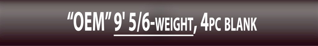 Why would I make a big deal out of our “OEM”, no label, least expensive blanks? Well, they’re excellent blanks and their specs are outstanding for the price. For instance, our OEM 9′ 5/6 4-piece blank is currently on sale for only$83.75 while competitors charge anywhere from $134.95 – 209.95 for a blank with similar specs. Beautiful Matte Black finish. (If you really ‘need’ to see a photo of a 4-pc, black blank, click here. All 4-piece and have no label which makes them perfect to build as a gift or presentation rod. Protective rod bag included. And of course we have kits! Check Kits Here